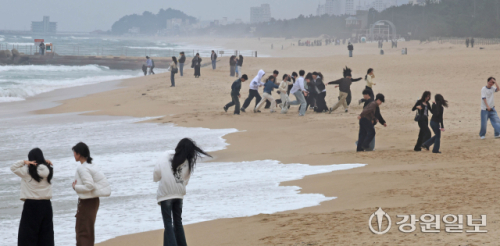 1일 강릉시 강문해변으로 봄소풍을 나온 고교생들이 백사장에서 추억을 남기고 있다. 강릉=권태명기자