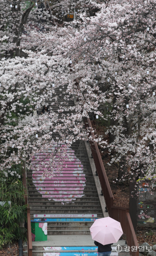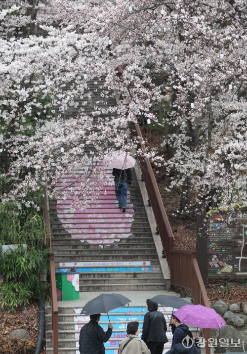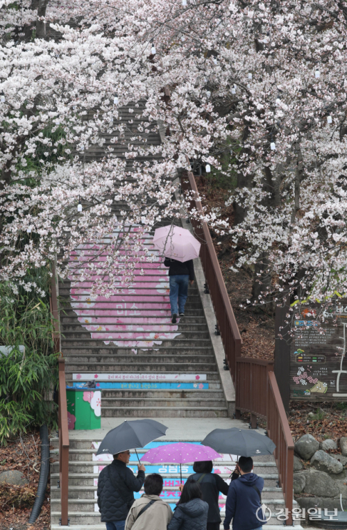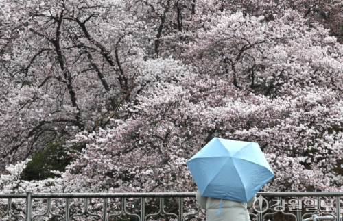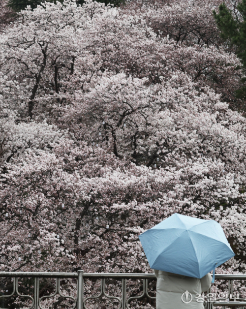 비가 내린 1일 강릉시 강남동 남산공원에 벚꽃이 개화를 시작해 우산을 쓰고 지나던 시민들의 눈길을 사로잡고 있다. 강릉의 3색 벚꽃축제인 경포벚꽃축제는 오는 4월4일부터 11일까지, 남산벚꽃축제, 솔올블라썸이 4월 3일부터 5일까지 열린다. 강릉=권태명기자