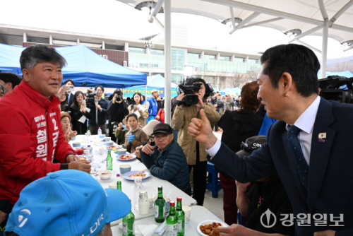 정청래 더불어민주당 당대표가 1일 철원읍에서 열린 철원읍민체육대회에 방문해 주민들과 인사 나누던 중 김동일 국민의힘 철원군수 예비후보에게 엄지를 들어올리고 있다. 신세희기자