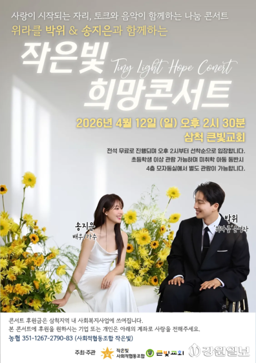 사회적협동조합 ‘작은빛’에 따르면 오는 12일 오후 2시30분 삼척 큰빛교회에서 시민들을 대상으로 작은빛 희망콘서트를 개최한다.