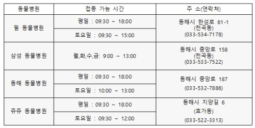 접종 대상은 생후 3개월 이상의 반려견 및 반려묘이며, 임신중인 동물은 접종 대상에서 제외된다. 접종은 동해동물병원, 삼성동물병원, 쥬쥬동물병원, 필동물병원 등 지정 동물병원 4개소이며 방문해 받을 수 있다.