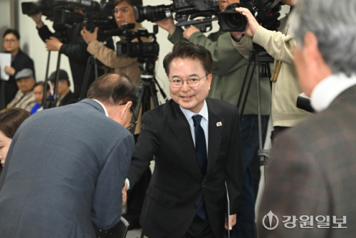 육동한 춘천시장이 2일 시청 브리핑룸에서 열린 6·3지선 시장 출마 선언 기자회견에 앞서 참석자들과 인사를 나누고 있다. 박승선기자