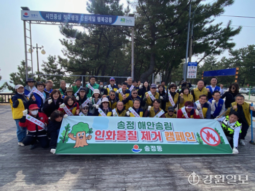 강릉시 송정동 주민센터는 지난 3일 송정·안목 해변 일원 송림에서 통장협의회, 주민자치회, 새마을협의회, 새마을부녀회, 바르게살기위원회, 자율방범대, 안목번영회 등 자생 단체 회원들과 함께 송림 내 솔잎을 제거하고 산불 예방 캠페인을 펼쳤다.