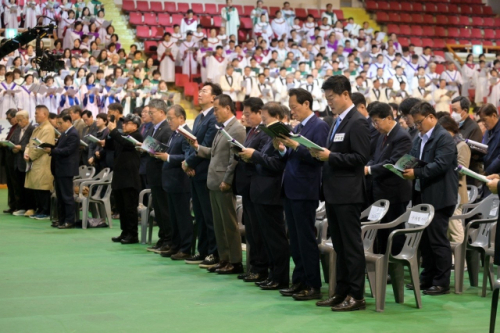 원주시기독교연합회 주관 '2026 부활절 연합예배'가 5일 원주 치악체육관에서 선우웅 연합회장과 김진태 강원특별자치도지사, 원강수 원주시장, 송기헌·박정하 국회의원, 우상호 민주당 강원자치도지사 예비후보 등이 참석한 가운데 열렸다.