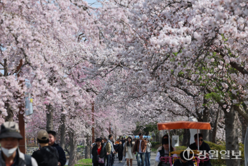 '2026 경포벚꽃축제'가 한창인 5일 강릉시 경포호 일원이 온통 만개한 벚꽃으로 꽃대궐을 이뤄 관광객들로 봄비고 있다. 강릉=권태명기자