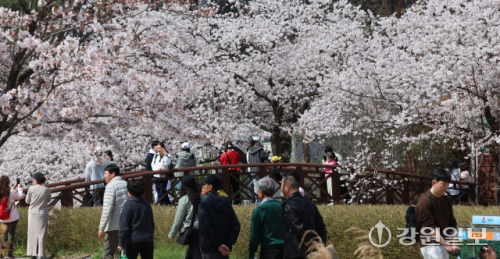 '2026 경포벚꽃축제'가 한창인 5일 강릉시 경포호 일원이 온통 만개한 벚꽃으로 꽃대궐을 뤄 관광객들로 봄비고 있다. 강릉=권태명기자