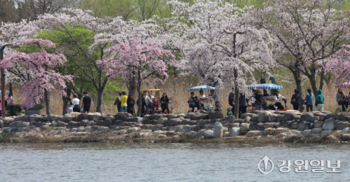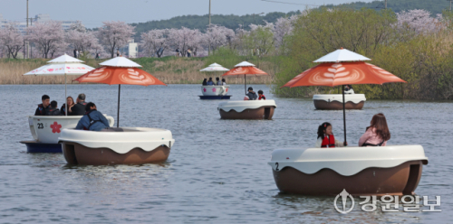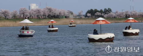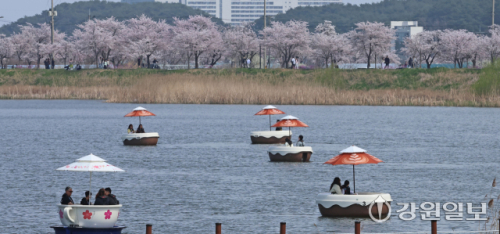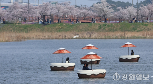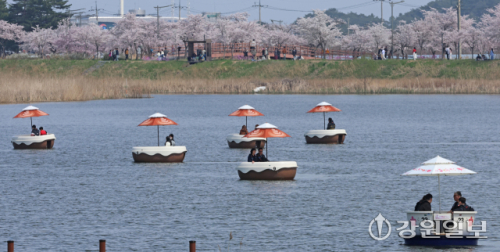 5일 강릉시 경포생태저류지 일원에 벚꽃이 만개한 가운데 행락객들이 저류지에서 뱃놀이하며 봄을 즐기고 있다. 강릉시는 벚꽃 시즌에 맞춰 시민과 관광객이 함께 즐길 수 있는 수변 체험 관광 콘텐츠 '오죽헌 전통 뱃놀이 체험 프로그램'을 새롭게 선보이고 있다.강릉=권태명기자