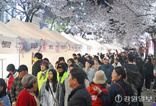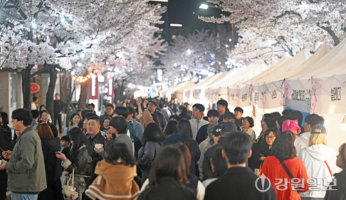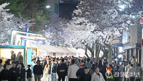 4일 밤 강릉시 교동택지에서 열린 '2026 강릉벚꽃축제'의 하나인 '솔올블라썸'에서 만개한 벚꽃나무 아래 시민 관광객들로 붐비고 있다. 강릉=권태명기자