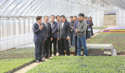 ◇김명기 횡성군수와 정운현 횡성군의회 부의장 등이 지난 3일 서원면 옥계2리 '사계절 화훼온실단지 준공식' 후 시설을 둘러보고 있다.