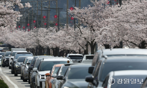 '2026 경포벚꽃축제'가 열리고 있는 6일 강릉시 경포호 일대가 평일에도 불구하고 상춘객 차량들이 몰리며 극심한 정체를 빚고 있다. 강릉=권태명기자
