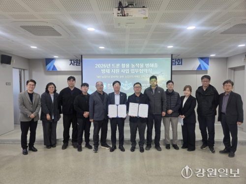 【춘천】 춘천시농업기술센터는 지난 7일 NH농협 춘천시지부, 지역 농축협과 ‘드론 활용 농작물 병해충 방제 지원사업’ 추진을 위한 업무협약을 맺었다.
