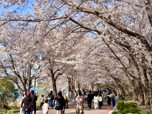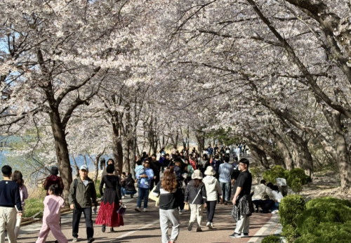 속초시 영랑호 벚꽃축제가 열린 지난 11~12일 행사장을 찾은 시민과 관광객들이 만개한 벚꽃과 함께 봄의 정취를 만끽하고 있다.