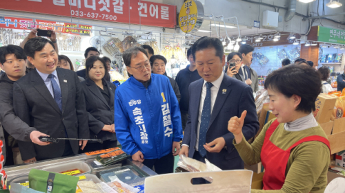 더불어민주당 정청래 대표가 12일 속초관광수산시장을 방문해 김도균 도당위원장, 우상호 도지사 예비후보, 김철수 속초시장 예비후보와 함께 상인들과 인사하고 있다. 속초=권원근기자