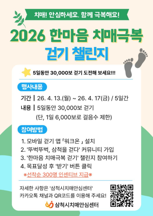 【삼척】삼척시보건소 치매안심샌터가 13일부터 17일까지 5일간 '2026 한마음 치매극복 걷기 챌린지'를 운영한다.
