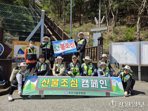 강릉시 옥천자율방범대(대장: 최도석)는 12일 강릉 안인 안보등산로 일원에 산불조심 현수막 게시하고, 쓰레기 줍기 활동을 진행하며 산불조심 캠페인을 진행했다.