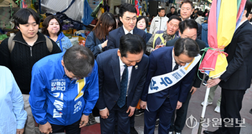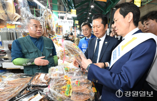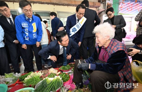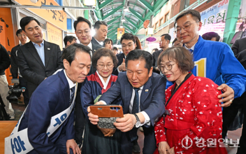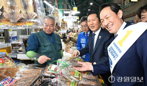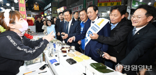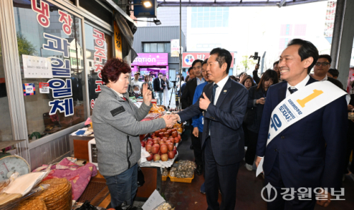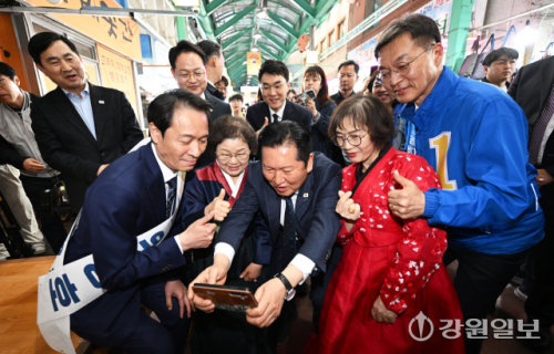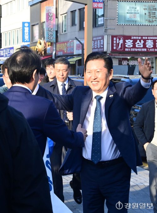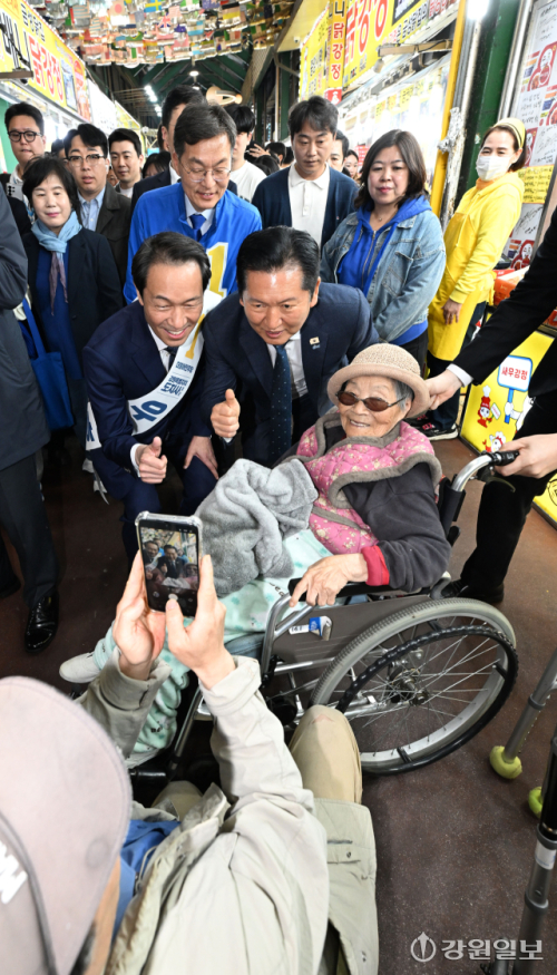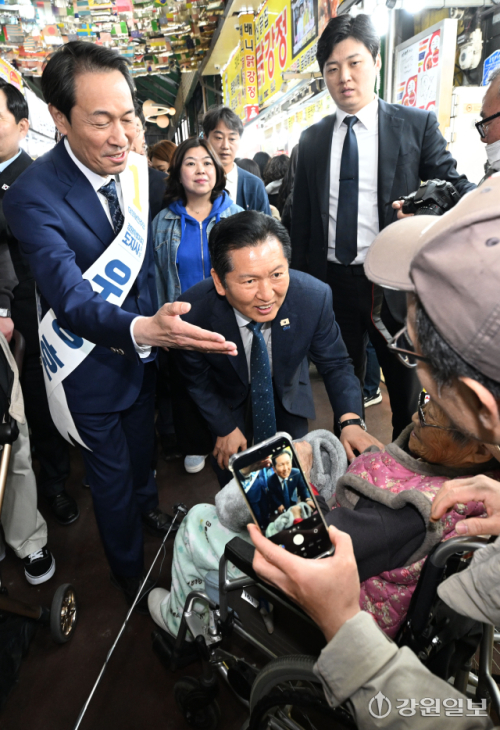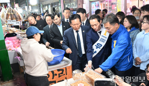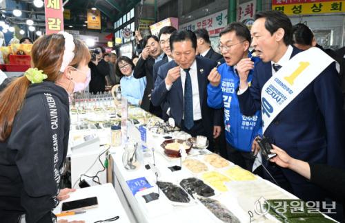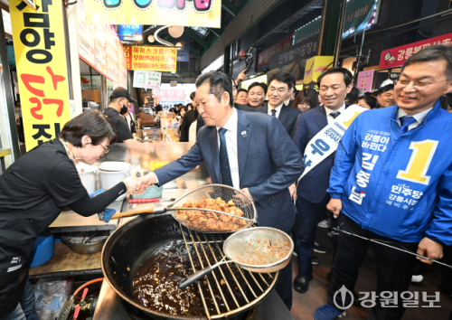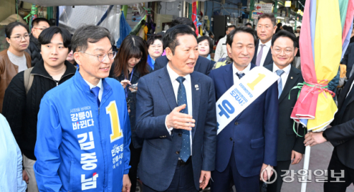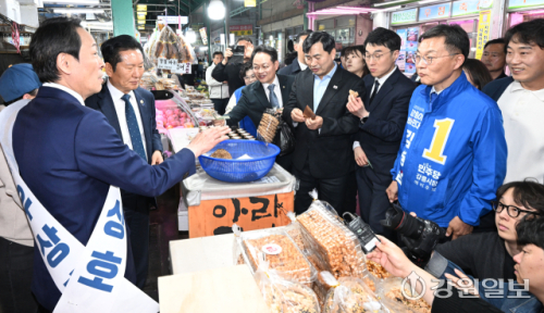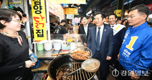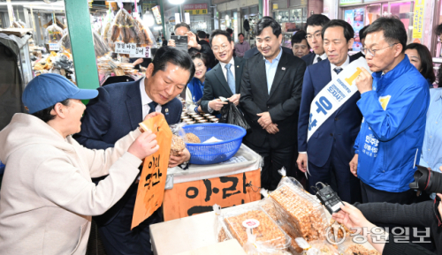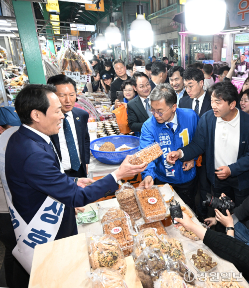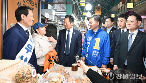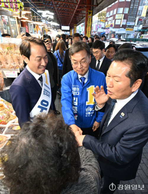 더불어민주당 정청래 대표가 11일 강릉시 중앙시장을 방문해 우상호 도지사 예비후보, 김중남 시장 예비후보를 지원하며 시민과 관광객들에게 지지를 호소하고 있다.강릉=권태명기자
