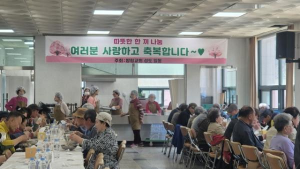 최종각 방림교회 목사는 “따뜻한 점심을 대접할 수 있어 감사하며 어르신들의 건강을 기원한다”며 “앞으로도 지역사회에 나눔을 지속적으로 실천하겠다”고 밝혔다.