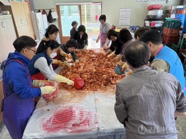태백 문곡소도동행정복지센터(동장:이문형)·문곡소도동지역사회보장협의체는 14일 동 행정복지센터에서 민·관 협력사업으로 ‘행복 겉절이 김치 나눔 행사’를 진행했다. 이날 협의체 위원, 공무원 등 20여명은 직접 김치를 담그고 상자에 포장했다. 마련된 김치 200상자는 지역 내 독거어르신, 저소득층 등에 전달될 예정이다.