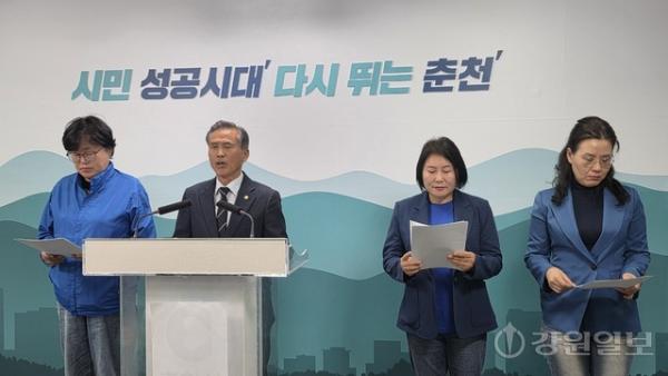 ◇박제철 국민의힘 춘천시의원 예비후보가 14일 주민복합문화센터 신축과 관련해 “더불어민주당이 노력 없는 성과 가로채기로 주민을 기만하고 있다”고 주장하며 기자회견을 열었다.