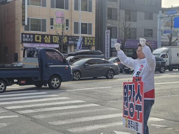 ◇국민의힘 소속 원강수 원주시장 예비후보가 14일 오전 관설동 일원에서 아침인사를 하고 있다.