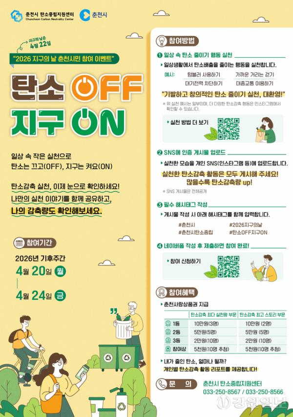 【춘천】춘천시 탄소중립지원센터는 제56회 지구의 날(4월 22일)을 기념해 오는 20일부터 24일까지 2026 지구의 날 춘천시민 참여 이벤트를 개최한다고 밝혔다.