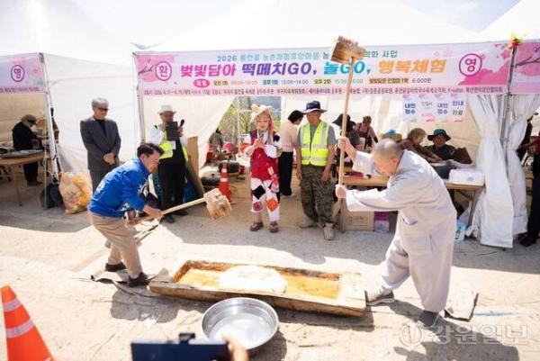 ◇육동한 더불어민주당 춘천시장 예비후보가 15일 오후 북산면 부귀리 벚꽃축제 현장을 찾아 만개한 벚꽃 아래서 청평사 도후 스님과 떡메치기 체험 등을 했다.