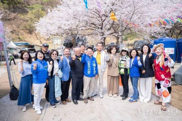 육동한 더불어민주당 춘천시장 예비후보는 15일 북산면 부귀리 일대에서 열린 ‘부귀리 벚꽃 잔치’ 개막식에 참석해 시민들과 봄기운을 나눴다.