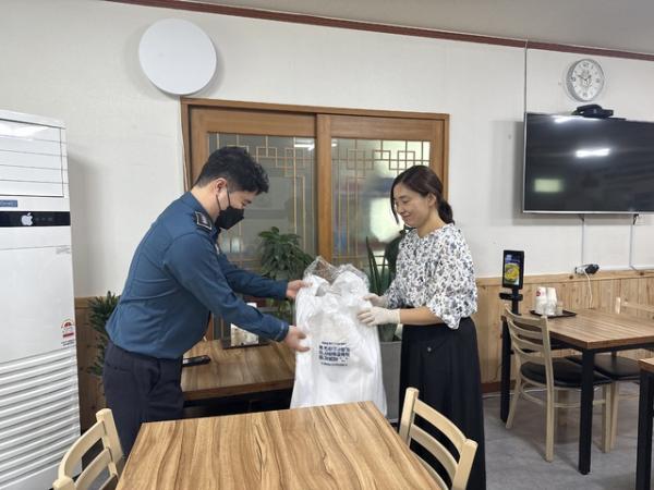 ◇강릉경찰서는 16일 ‘학교폭력 예방 사행시 공모전’ 수상작이 인쇄된 홍보용 일회용 앞치마를 배부했다. 사진=강릉경찰서 제공.