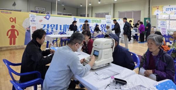 홍천군과 NH농협 홍천군지부(지부장:김준태), 내면농협(조합장:권영대)은 15일 내면고원체육공원에서 상지대 부속 한방병원과 함께 ‘농촌 왕진 버스’를 운영하고 주민 300명을 대상으로 한방 진료, 시력 검안 등을 했다.
