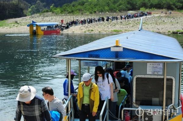 영화 ‘왕과 사는 남자’ 흥행 영향으로 관광객이 급증한 가운데 평일인 16일 영월 청령포에서 몰린 방문객들이 도선을 이용해 섬으로 이동하고 있다.