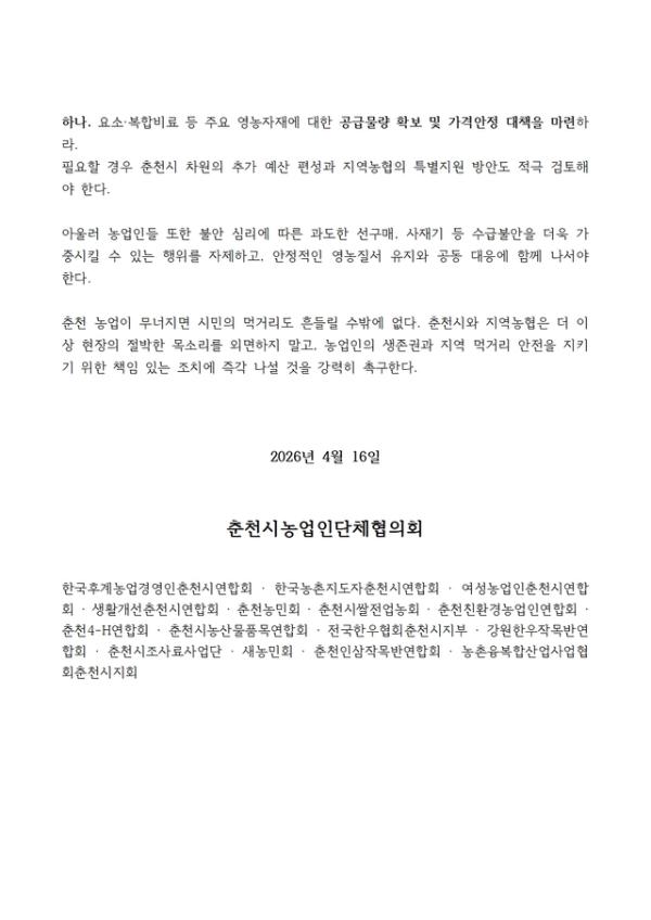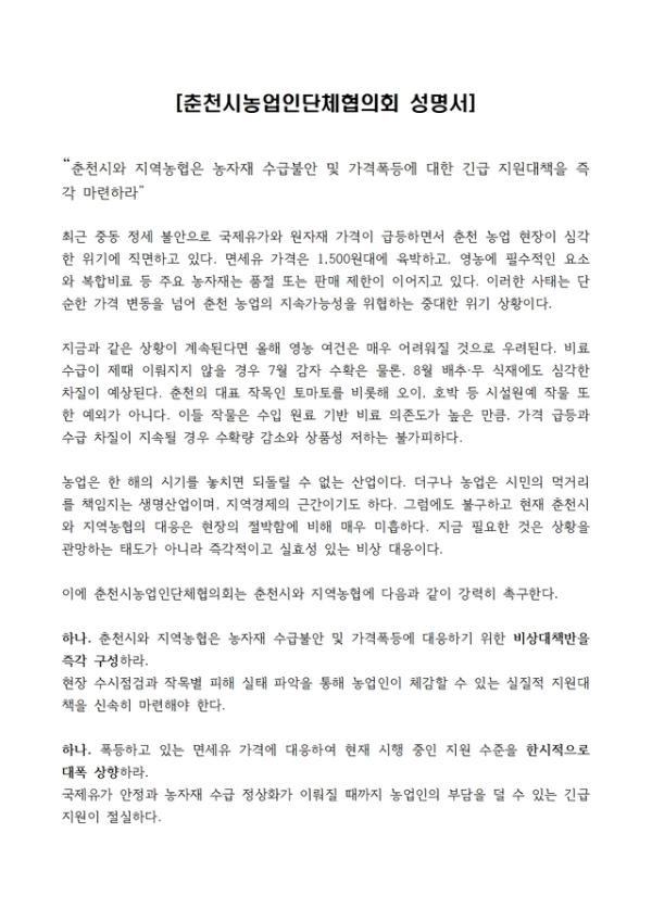 춘천시농업인단체협의회가 농자재 수급불안과 가격폭등이 이어지고 있다며 춘천시와 지역농협에 지원대책을 마련하라고 촉구했다.