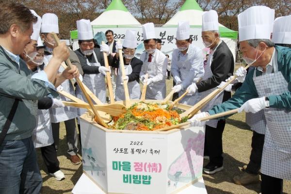 18일 속초시 상도문 돌담마을 일대에서 열린 ‘상도문 봄맞이 축제’에 참가한 초청인사들이 비빔밥 퍼포먼스를 하고 있다.
