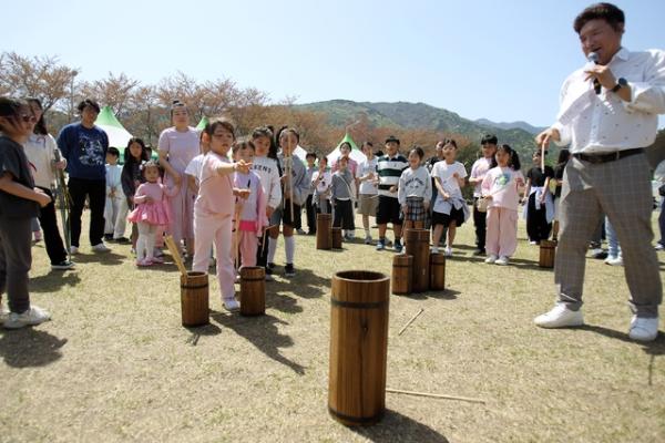 18일 속초시 상도문 돌담마을 일대에서 열린 ‘상도문 봄맞이 축제’에 참가한 어린이들이 투호놀이 게임을 즐기고 있다.