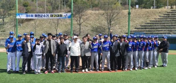 제6회 화천군수기 야구대회 개회식이 18일 간동면 간동야구장에서 최문순 군수와 송호관 화천군체육회장을 비롯한 동호인과 내빈이 참석한 가운데 열렸다.