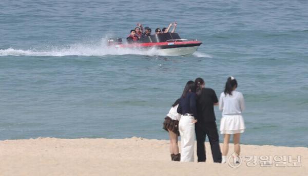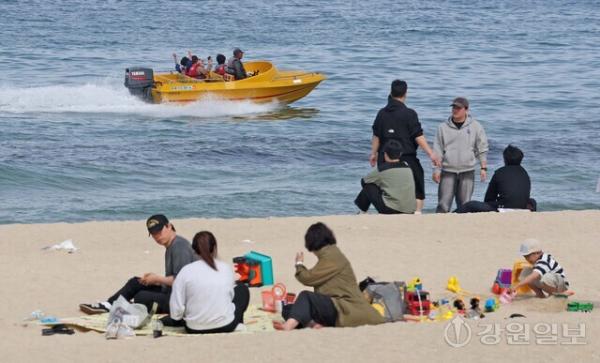 낮 최고기온이 20도를 웃돌며 초여름 날씨를 보인 19일 강릉 경포해변을 찾은 관광객들이 보트를 타며 더위를 식히고 있다. 강릉=권태명기자