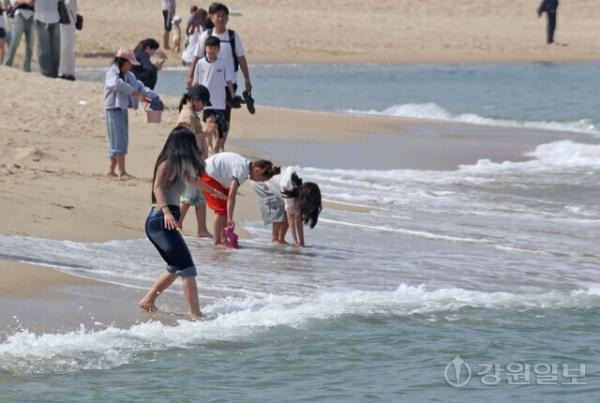 낮 최고기온이 20도를 웃도는 초여름 날씨를 보인 19일 강릉 강문해변에는 어린이들이 바닷물에 발을 담그며 더위를 식히고 있다. 강릉=권태명기자