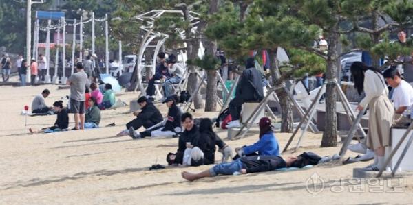낮최고기온이 20도를 웃도는 초여름 날씨를 보인 19일 강릉 강문해변 나무그늘에 더위를 식히려는 관광객들이 모여앉아 쉬고 있다. 강릉=권태명기자