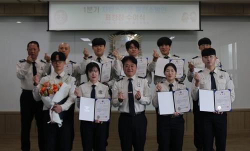 홍천소방서(서장:이강우)는 21일 본서 대회의실에서 ‘2026년 1분기 자랑스러운 홍천소방인’ 표창 수여식을 개최했다. 이번 표창은 소방 발전 기여도와 성실한 근무태도, 조직 내 기여도를 고려해 소방장 심명섭·고백규·왕대균, 소방교 채진하·장준환·원대호, 소방사 송주현·홍윤정·이원섭·정민수·최영재 등 11명이 선정됐다.
