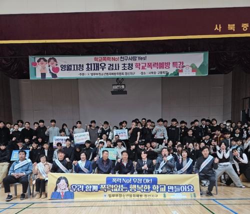 법무부청소년범죄예방위원회 정선지구(회장:장기봉)가 지난 20일 사북중·고등학교 체육관에서 학교폭력 예방 교육을 실시한 가운데 최재우 영월지청 검사가 특강을 실시해 큰 호응을 얻었다. 정선=김영석기자 xxx711125xxxxxxxxxxxxx