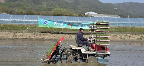 양구군은 21일 양구읍 학조리 박봉화 씨 농가 논 3,778㎡에서 첫 이앙 작업을 진행하고 풍년 농사를 기원했다. 이날 심은 오대벼는 약 120일간 생육 과정을 거쳐 오는 8월20일께 첫 수확이 이뤄질 전망이다.