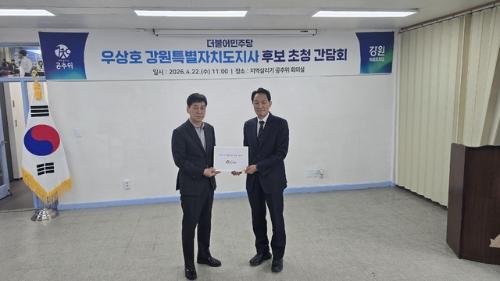 ◇더불어민주당 우상호 강원특별자치도지사 예비후보가 22일 정선 사북읍 지역살리기 공추위 회의실에서 열린 후보 초청 간담회에 참석한 가운데 안승재 지역살리기 공추위원장이 우 예비후보에게 지역 건의서를 전달했다.