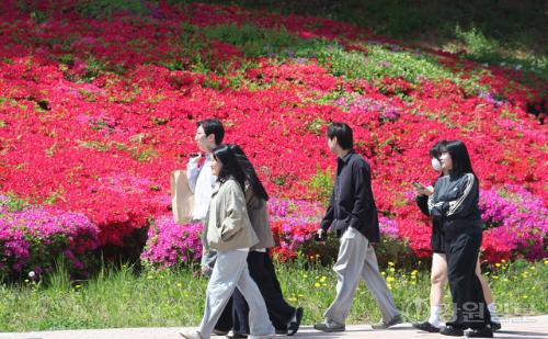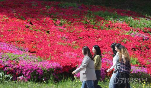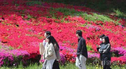 화창한 날씨를 보인 23일 강원대 강릉캠퍼스에서 학생들이 만개한 영산홍 길을 따라 강의실로 향하고 있다.