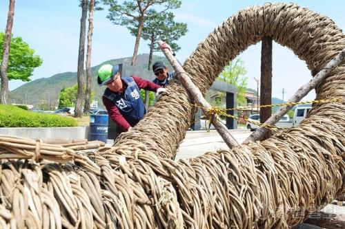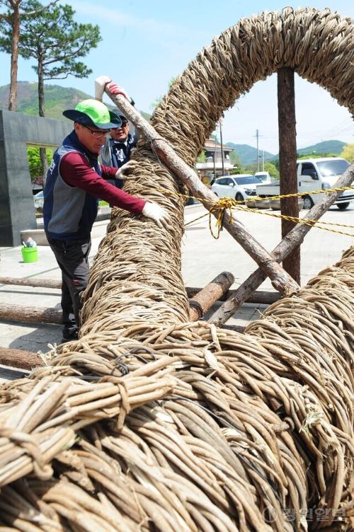 제59회 단종문화제 개막을 하루 앞둔 23일 영월문화예술회관 앞에서 영월칡줄다리기보존회 회원들이 무게 4톤, 길이 28m의 초대형 칡줄을 제작하고 있다. 영월=오윤석기자
