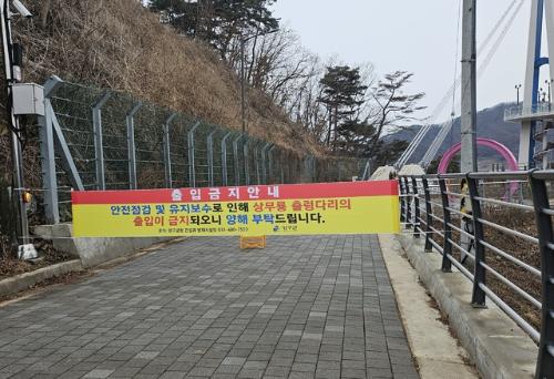 양구군에 따르면 상무룡 출렁다리는 지난 2월23일 해빙기 안전점검 과정에서 교량 브라켓 일부 벌어짐 현상이 발견되면서 즉시 출입이 통제됐다. 군은 다음 날인 2월24일 안전띠와 펜스를 설치하고 현수막을 게시하는 등 이용을 전면 제한했다. 이후 정밀점검과 현장조사를 거쳐 보수 설계에 착수했다. 보수공사는 다음달 중 시작해 6월30일까지 마무리할 계획이다.