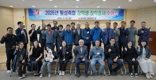 【횡성】횡성축협(조합장:엄경익)은 24일 축협 대회의실에서 ‘2026년 횡성축협 장학생 장학증서 수여식’을 갖고 조합원 자녀 14명에게 총 1,320만원의 장학금을 전달했다.