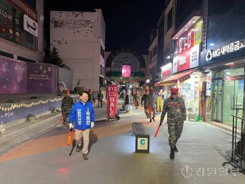 ◇육동한 더불어민주당 춘천시장 후보는 지난 24일 춘천시해병대전우회와 함께 야간 순찰에 나서 밤길 안전과 지역 치안 현장을 점검했다.