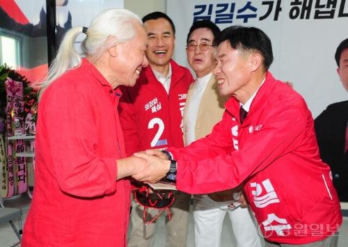 국민의힘 김길수 영월군수는 지난 24일 영월읍 중앙로 선거사무소에서 지지자들과 악수를 하고 있다. 영월=오윤석기자