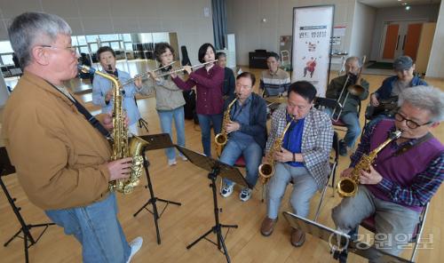 지난 22일, 춘천북부노인복지관의 한 연습실. 박교선(68) 강사의 지휘에 따라 평균 나이 70대 초반의 어르신들이 색소폰, 클라리넷 등 다양한 관악기를 입에 물고 힘껏 숨을 내쉬자 깔끔하면서도 웅장한 음색이 연습실을 가득 채웠다. 연주가 끝나고 호흡을 가다듬기 위해 긴 한숨을 내쉬면서도, 머리가 희끗한 어르신들의 얼굴에는 만족스러운 환한 웃음꽃이 피어났다.