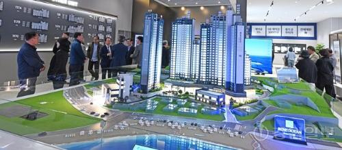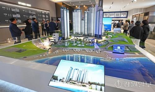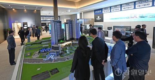 고성군 토성면 청간리에 들어서는 ‘르네오션 고성 퍼스트뷰’ 모델하우스 오픈식이 23일 속초시 조양동에서 열려 참석자들이 단지 모형도 등을 둘러보고 있다. ‘르네오션 고성 퍼스트뷰’는 지하 1층~지상 최고 29층, 3개 동, 전용면적 74~183㎡ 총 263세대 규모로 조성된다. 입주는 2029년 3월 예정이다.