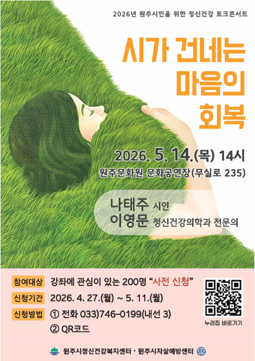 【원주】원주시정신건강복지센터가 다음달 14일 원주문화원 문화공연장에서 ‘시가 건네는 마음의 회복’을 주제로 정신건강 토크콘서트를 개최한다.